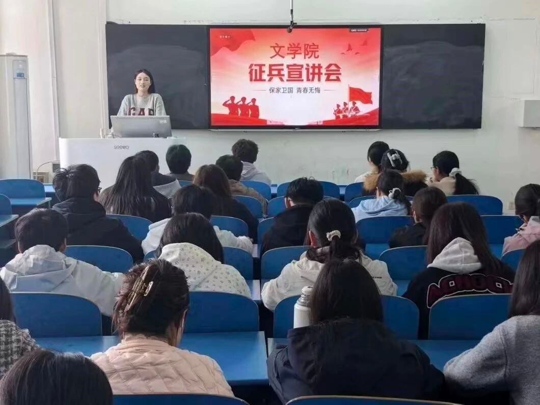 为做好大学生征兵宣传工作,激发青年学子投身国防事业的热情,4月7日下午,文学院在1411教室举办2026年春季征兵政策宣讲会。2022级汉语国际教育专业退役复学学生杨靖恺担任主讲。