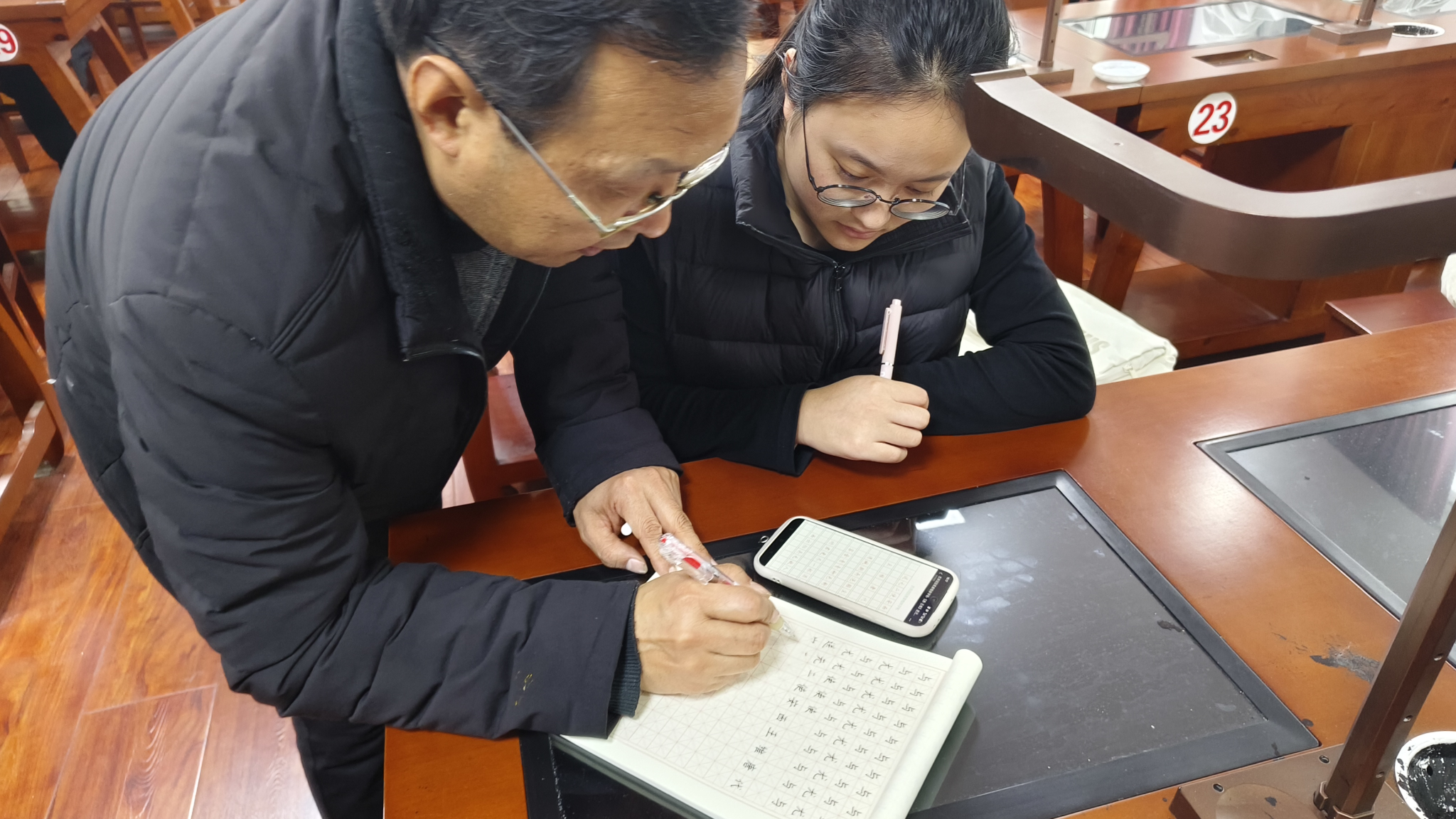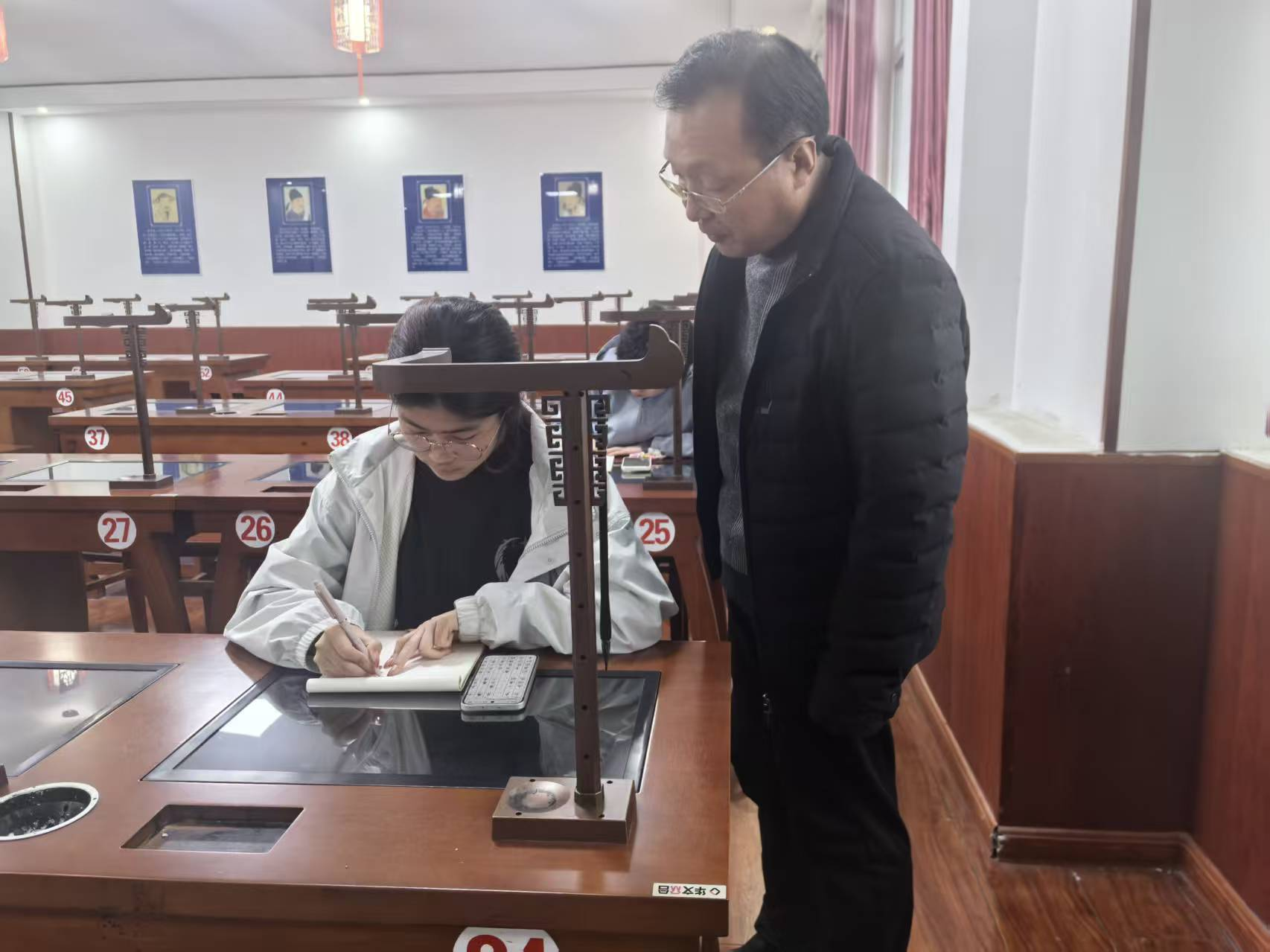 当天,李东晓老师率先为同学们讲授硬笔书法技能。他结合日本书道申遗成功案例、“小明书法”现象及中国书法教育现存问题,向同学们阐明了学习、传承和弘扬中国书法艺术的重要性。他表示,日本书道源于中国书法,其艺术水准和传承教育不亚于中国;李明同学练习书法非常刻苦,用力甚勤,但其“小明书法”属于“江湖体”,这都说明我们现存诸多问题,需要开展正规的书法教育,做好书法艺术传承。李东晓老师从汉字笔画书写技巧、汉字间架结构、书法理论等讲起,为大家简单梳理了中国书法发展史。书写技能训练中,他为大家开展一对一指导,不时纠正大家的握笔姿势,强调“笔需尽量垂直于桌面。他向同学们推荐了邹慕白、田英章等书法家的字帖,鼓励大家找到喜爱的字体,从临摹入手,持之以恒地训练,不断提升书写水平。