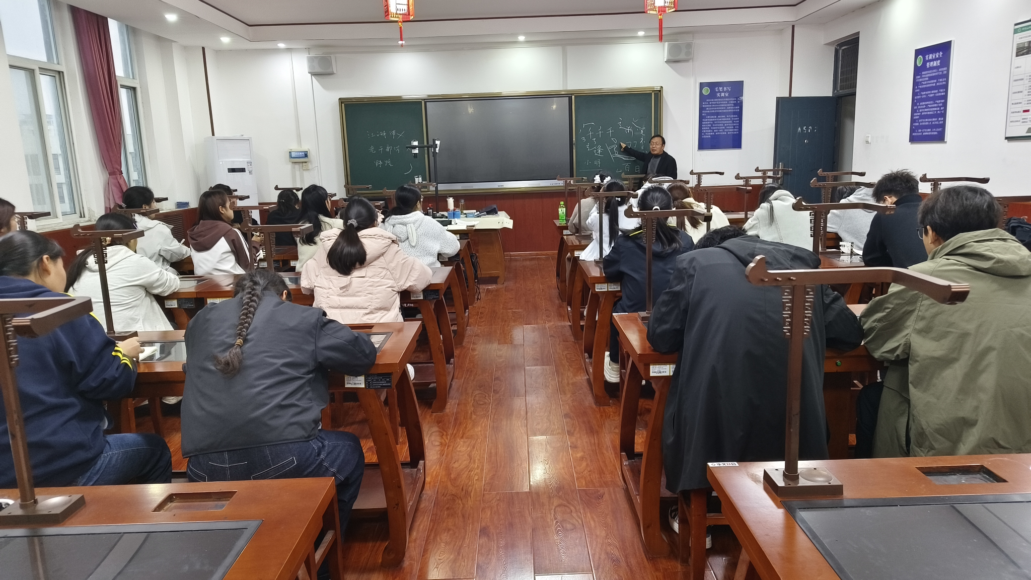 为备战教育部第八届中华经典诵写讲大赛之“笔墨中国”汉字书写大赛,锻炼在校师范生的教学基本功,夯实硬笔、软笔、粉笔三笔书写技能,10月30日下午,文学院中华经典诵写讲大赛汉字书写赛前辅导第二课堂在艺术楼A502教室正式启动。该课程由郑黎阳、李东晓、朱玉雯等三位老师担任主讲,来自文学院不同年级的师范生报名学习。