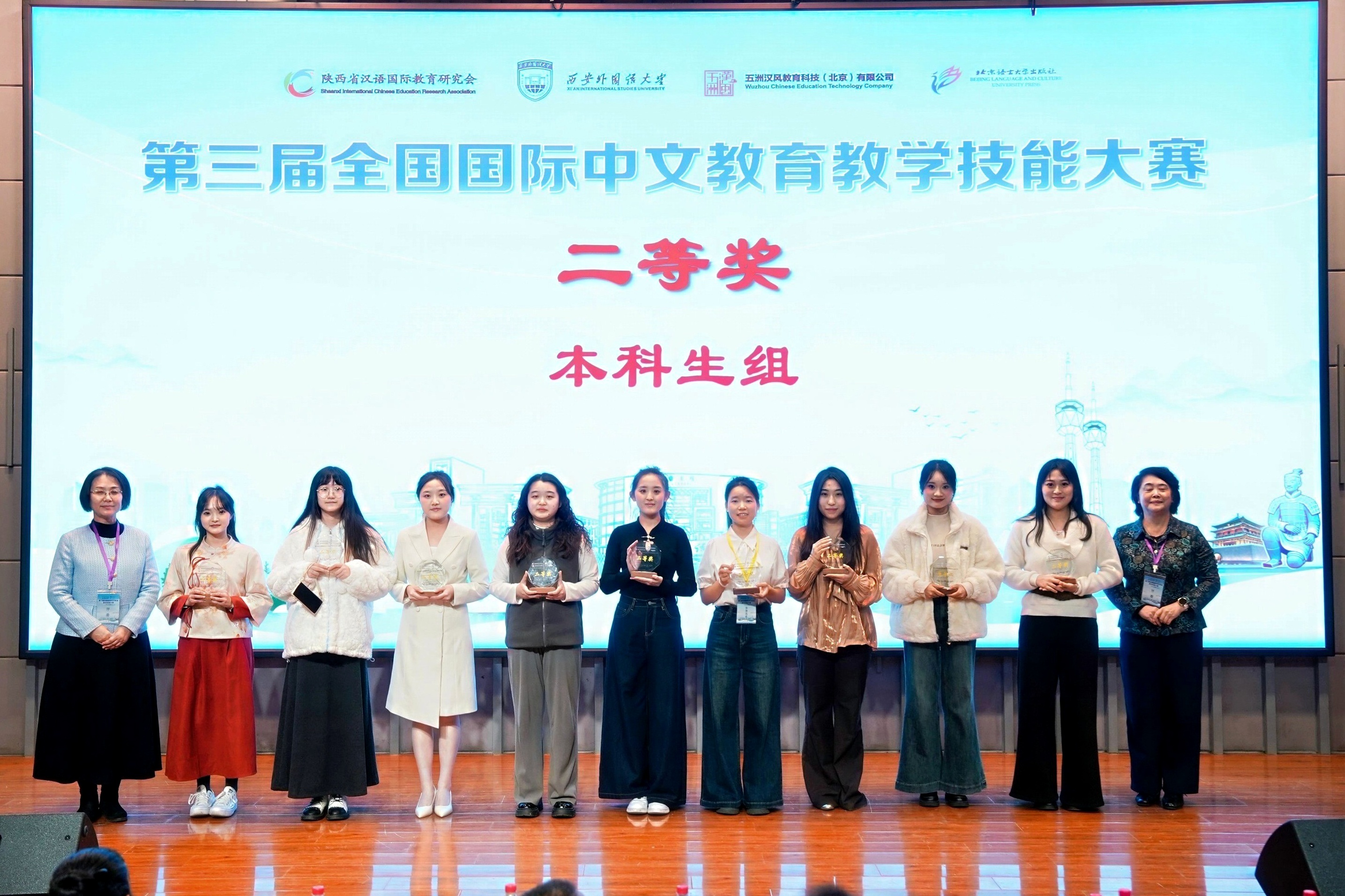 本次大赛分本科生、研究生及留学生三个赛道,涵盖说课、讲课(含语音教学专项)、中英文问答及中华才艺展示四个环节,全面考察参赛选手的国际中文教育教学能力与综合素养。大赛首次引入“汉风语音通”语音教学平台作为语音教学专项考核工具,体现了国际中文教育数字化发展的新趋势。备赛期间,文学院按照“项目化+导师制”要求,选派骨干教师采取“集体指导与个别辅导相结合”的训练方式,为选手提供了从教学设计、模拟演练到临场应对的全方位指导。在为期两天的激烈角逐中,文学院学生沉着应战、发挥出色,最终,李佳雨获本科生组全国二等奖,姜舒涵、刘凡语、余方圆获优秀奖,张铭格、张淑洁、杨博兰获研究生组优秀奖。