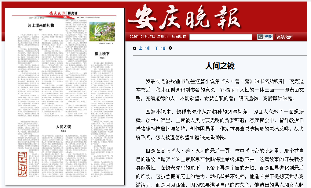 编者按:本文原载于《安庆晚报》2026年4月17日第A06版(月光城),作者是文学院2025级汉语言文学3班学生陈姿含。该文写作者阅读钱锺书《人・兽・鬼》的感悟,重点解读了《上帝的梦》:上帝因孤独虚荣造人,遭冷落便报复,梦醒仍孤身。作者借此讽刺人性弱点,反思人际关系,提醒读者不必强求成为他人中心,应在独处中锚定内心,兼具文学赏析与人生思考。